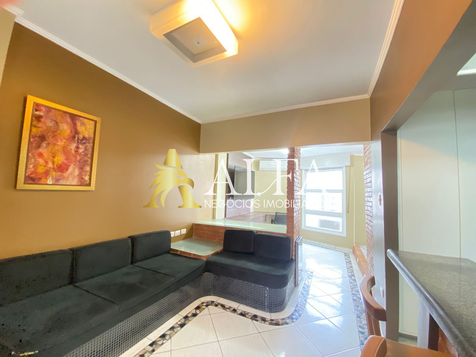 A sala para dois ambientes é integrada à cozinha em conceito aberto, criando um espaço moderno e aconchegante.